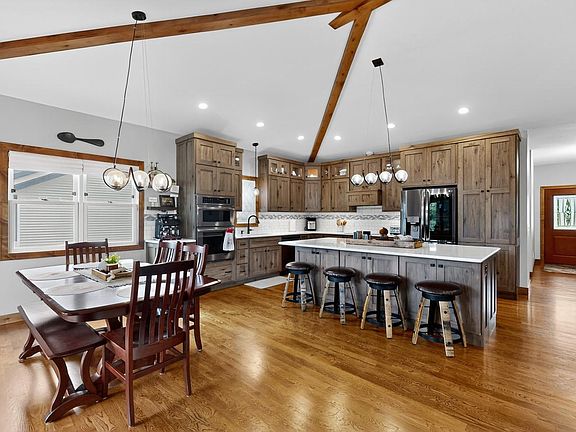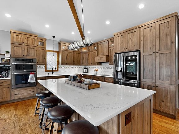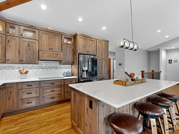 Perched on a hilltop with sweeping city views, this 2023-built home sits on a beautifully landscaped 1.26-acre lot. With smart siding, stone accents, a composite deck (partially covered), and a stamped concrete patio with fire pit, outdoor living is just as impressive as the interior. Step inside the 1,688 sq ft main level and enjoy main-floor living at its finest. The open-concept layout features vaulted ceilings, white oak hardwood floors, and an electric fireplace. The gourmet kitchen boasts a huge center island with quartz countertops, rustic hickory cabinetry, ceramic backsplash, pot filler, and premium finishes throughout. The spacious primary suite is a true retreat, featuring a tray ceiling (10’ high), walk-in closet, luxurious 3/4 bath with roll-in ceramic tile shower, and direct access to a private laundry room. Enjoy separate-zone heating for personalized comfort. An additional den/office on the main floor is currently used as a bedroom for added flexibility. The walkout lower level includes a huge family room, 2 large bedrooms, full bathroom, spacious rec room perfect for a home gym, theater, or playroom. The home also features a 3-car attached heated garage, fully finished with a sink, central vacuum, and pressure washer, plus a tuck-under 1-car garage below for extra storage, workshop, or toy parking. Other highlights include Andersen windows, 9 foot ceilings, 3 foot wide doors throughout, composite deck and professionally landscaped yard. This exceptional home combines style, space, and smart design. Skip the stress of building and enjoy luxury living now! Why build when this immaculate, move-in-ready home offers top-of-the-line finishes, breathtaking views, and every feature you could want?
