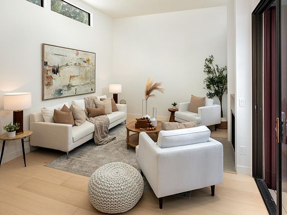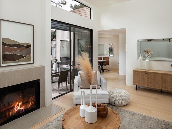 Stunning top floor corner unit at award winning The Lakes development. Spacious floorplan w/ 1,414 square feet of living space, 12 ft high ceilings, clerestory windows, 8 ft tall sliding glass doors & abundant natural light, this condo has it all. Beautiful NEW European White Oak wide plank hardwood floors flow continuously throughout the home. Large remodeled open kitchen with quartz countertops & newer cabinetry features abundant counter & cupboard space, pantry, stainless steel appliances & greenhouse window. Roomy living room w/ woodburning fireplace & designer tile surround. Sliding glass doors lead to deck overlooking pool, spa & parklike grounds. Unique full size dining room w/ curved exterior wall. Large primary bedroom suite with high ceilings, two closets, & plantation shutters on glass doors leading to secondary deck. Updated primary bath has new vanity with 2 sinks. Generously sized 2nd and 3rd bedroom. Inside laundry w/ full size washer & dryer. One car garage with storage & extra parking spaces. Complex amenities include pool, spa, greenbelt and stream. Conveniently located close to downtown Mountain Views many restaurants, CatTrain & LightRail. Easy access to Highways 101, 237,85 & Central Expressway all leading to major employers & the heart of Silicon Valley.