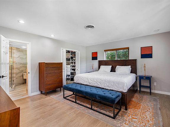 Stunning reimagined Mid-Century modern in sought-after East Miami Shores, steps from Biscayne Bay. This 3BR/3BA gem sits on an oversized 8,368 SF lot and blends timeless architecture with modern upgrades. Bright open floor plan showcases new flooring, designer-finished baths, and a sleek kitchen with premium appliances. Impact windows, lush landscaping, and a screened-in pool patio create a private resort-style retreat perfect for entertaining. Rear-entry 2-car garage offers storage with flexible potential for guest suite, office, or gym. Ideally located near top schools, golf, tennis, aquatic center, parks, shopping & dining offering luxury living and everyday convenience.