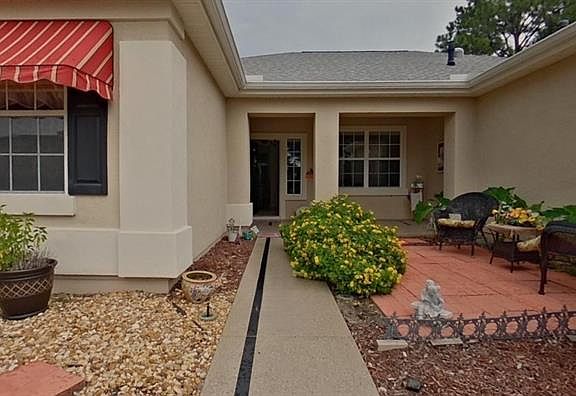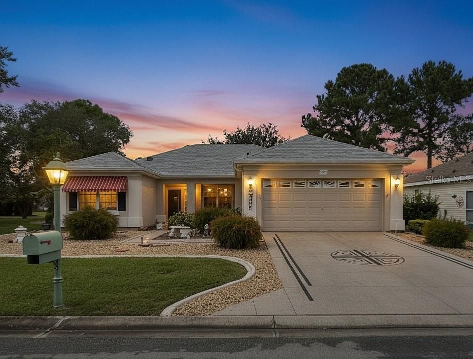 One or more photo(s) has been virtually staged. This SAN MATEO home in the gated, guarded active adult community offers 2 bedrooms and 2 baths, a two-car garage, and an open floor plan. Crown molding runs throughout the home. The living room features tile flooring, a ceiling fan, and sliding doors to the sunroom, which was added in 2016 and includes a portable AC with views of lush green space. The kitchen is bright and functional, with crown molding, a ceiling fan, a solar tube added in 2017, a custom island, stainless steel appliances including a new refrigerator, and ample bar seating. The primary bathroom features crown molding, dual vanities at varying heights, a solar tube, safety grab bars, and abundant mirrors. The secondary bath includes a ceiling fan, medicine cabinet, and shower/tub combination. The second bedroom offers a Murphy bed, built-in mirrored closet, crown molding, ceiling fan, and natural light. The backyard is private with pavers highlighting the sunroom addition and a retractable awning for shade. The front porch and entryway provide a welcoming space for outdoor seating. Roof replaced in 2023.