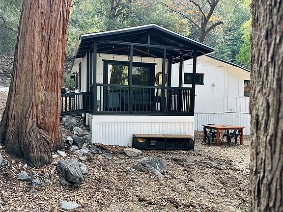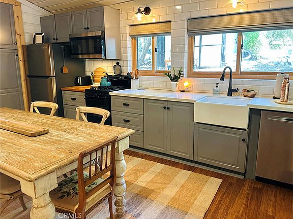 This fully refreshed 2-bedroom, 1-bath home has been remodeled with care, offering a warm and comfortable single-level living experience that’s truly move-in ready. With its peaceful setting and turnkey updates, the property has also been a SUCCESSFUL VACATION RENTAL, though buyers should verify all rental requirements and possibilities with the county. The covered entry opens to an inviting living room with a stone fireplace, connecting to a bright kitchen with white stone counters, an oversized sink, tile backsplash, and stainless appliances. Dual-glazed windows, a blend of restored fir floors and new composite wood, and forced-air heating help keep the home cozy in every season. The primary bedroom leads to a private balcony with forest views and a glimpse of San Bernardino Peak, while the updated bathroom connects to a second bedroom with bunk beds for added versatility. Outside, two detached sheds provide convenient storage, and the backyard now includes a fun dart/game area along with neatly organized firewood for easy use.