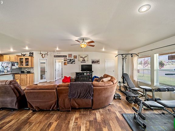 Beautiful newer triple wide with open great room, split floor plan and nice upgrades throughout.Kitchen has nice eat at breakfast bar and dining area has built in cabinets for plenty of additionalstorage or bar area, large back deck overlooks the 78 acres with half pivot and nice Cascade and SmithRock views. Detached garage is 2112 sq ft with separate shop area.