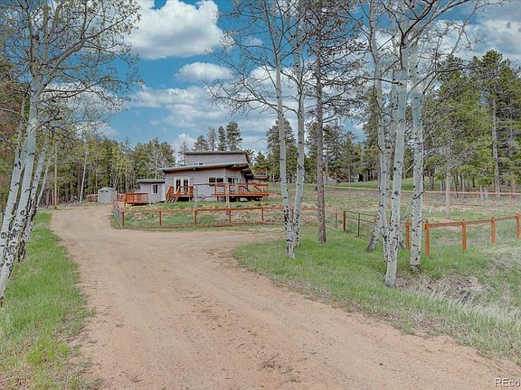 PRICE REDUCTION! on this charming 4-bedroom, 2-bathroom mountain contemporary nestled on 1.11 usable acres in Black Mountain Ranch Estates subdivision in desirable Jefferson county. This inviting home offers a partial fenced-in yard perfect for pets and a blend of comfort and style with thoughtful updates throughout, including an updated white brick fireplace with a pellet stove for those cozy winter nights. The beautifully remodeled kitchen features rich soapstone countertops, a crisp white tile backsplash, a new sink, and stainless steel appliances. Fresh interior paint, updated lighting, and modernized bathrooms add a clean, refreshed feel. A bonus guest suite or potential mother-in-law space with a private entrance offers flexibility for guests or multi-generational living. Upstairs, the open loft area includes two distinct spaces—ideal for a bedroom, home office, den, or flex area with a sliding glass door that opens to one of four private decks, each offering peaceful outdoor retreats. Enjoy ample parking, an attached storage room on the east side, and two additional sheds that remain with the property. Whether you’re entertaining, relaxing, or soaking in the mountain air and watching local wildlife, this property offers it all. Close access to hiking and biking trails and Conifer & Evergreen shopping and amenities. Don’t miss the opportunity to make this mountain gem your own!