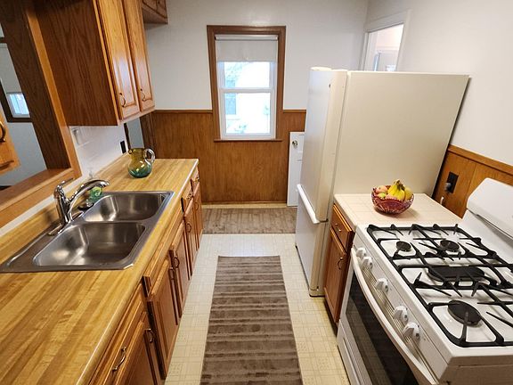 creating a warm and cohesive feel throughout. The kitchen features a gas stove and a unique
