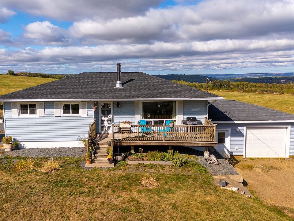 Welcome to 929 Canaan Mountain Road, a cozy bungalow nestled into the side of Canaan Mountain, surrounded by agricultural fields and expansive views of the North Mountain beyond! Featuring a new attached single car garage and a partially finished basement complete with workshop and woodstove, this home has lots of room for your family to expand! Two separate driveways - one asphalt and one gravel - provide ample parking for multiple vehicles, and two large decks - one south facing and one north facing - provide extra outdoor living spaces to enjoy your morning coffee while you watch the sunrise, as well as a place to BBQ and entertain guests while the sun sets gently over the fields behind the home. The living room is flooded with lots of natural light from the large windows, and the eat in kitchen is huge, featuring a mudroom and laundry area adjacent to the entrance to the back deck. Efficiently heated with a propane hot water furnace, this home is located only 5 minutes from the amenities of New Minas but still remains within the Gaspereau Elementary School catchment area. With its natural surroundings and proximity to services, this home is ideal for the first time home buyer or the growing family - so don't delay and book your showing today!