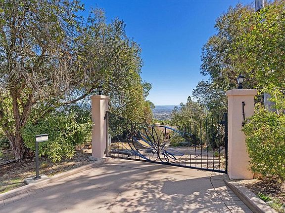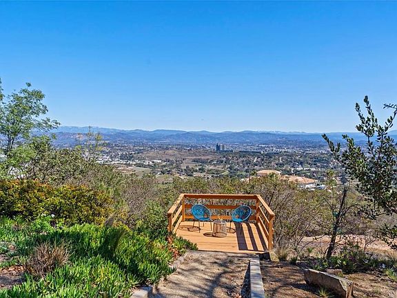 Nestled on a cul-de-sac behind a private gated entrance in the highly coveted Coronado Hills, this stunning single-story home sits high above San Marcos on over an acre of land, offering unparalleled privacy, breathtaking panoramic and mountain views, and modern convenience. Thoughtfully updated throughout, this home features three spacious bedrooms, two and a half bathrooms, and an array of high-end upgrades, making it the perfect blend of comfort, tranquility, style and functionality. From the moment you step inside, you’ll be captivated by the soaring vaulted circular wood ceiling and expansive floor-to-ceiling double pained windows flooding the space with natural light and panoramic views. The open-concept living area is anchored by a striking cast iron wood-burning fireplace, creating a warm and inviting ambiance. Fresh interior and exterior paint, new flooring, and recessed lighting enhance the modern yet timeless aesthetic. The chef’s kitchen is designed for both beauty and functionality, featuring sleek quartz countertops, maple shaker cabinetry, and a custom-built dining table perfect for gatherings. The primary suite is a private sanctuary where you’ll wake up to breathtaking views and enjoy direct access to the backyard and viewing deck. The spa-like ensuite bathroom boasts a walk-in shower, dual vanities, and a spacious walk-in closet, creating a true retreat experience. Sitting on over an acre with no HOA restrictions, potential for an ADU, workshop or further customize the space to fit your lifestyle. Additional features include EV charger hookup within a two-car garage, a secure pet enclosure, a dedicated garden space, an expansive stamped concrete driveway with ample parking, and zoning for top-rated Double Peak Schools. Located in a peaceful yet vibrant community with easy access to hiking trails, parks, and local amenities, this extraordinary residence offers a rare opportunity to own a piece of Coronado Hills paradise. Don’t miss out—schedule your private tour today and experience this one-of-a-kind home for yourself!