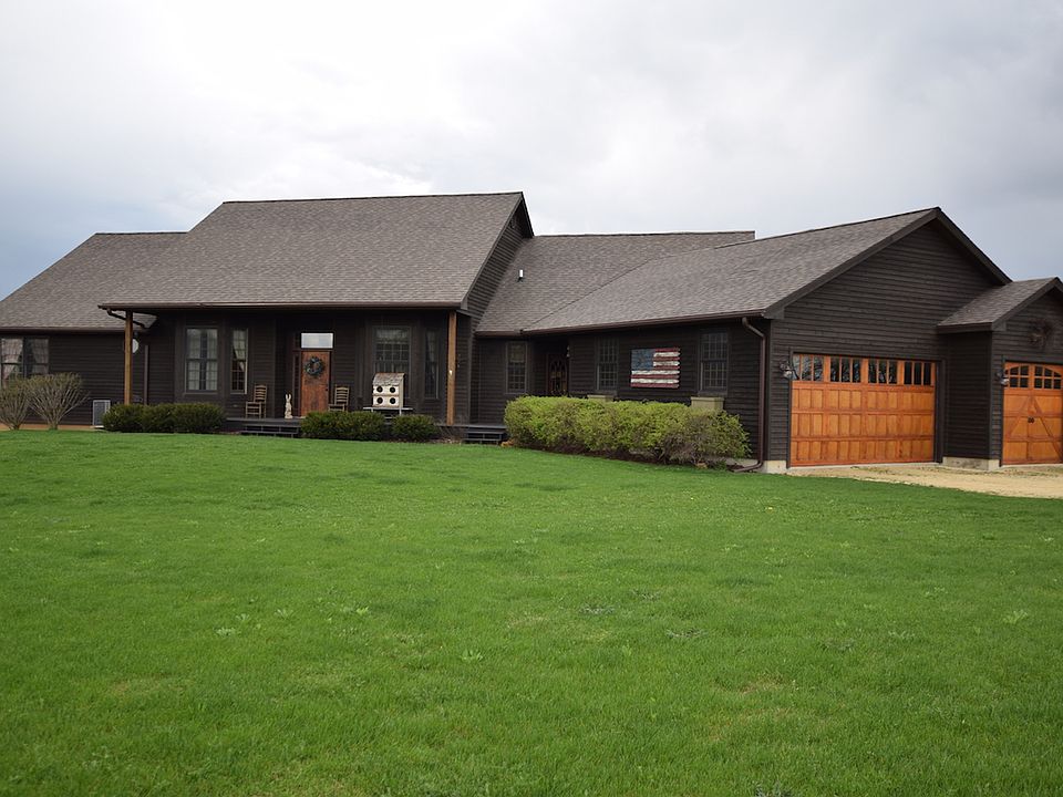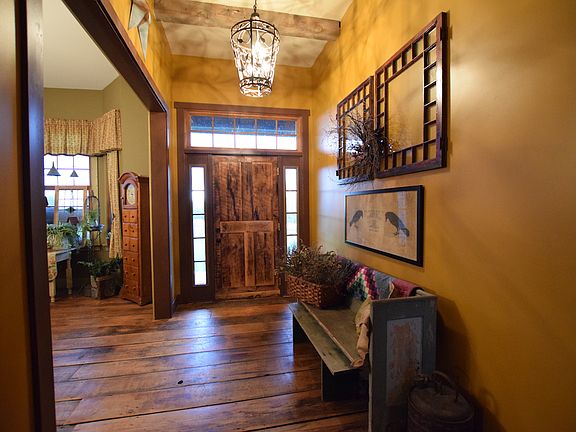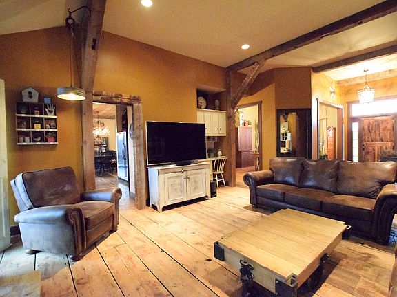 Stunning country setting w/ rustic features throughout. If it is wood, it is more than likely reclaimed barn wood, including the majority of the flooring, doors, and stairs. Custom front door leads to the foyer w/ exposed beams that is open to the dining room w/ bay window. Living room w/ exposed beams and entire back wall covered in stone surrounding the fireplace. Spacious kitchen w/ upgraded SS appliances, custom island/cabinets, under mount farm sink and eating area w/ large table space and barn wood ceilings. Kitchen also features a dual fuel stove w/ side oven, side by side refrigerator, granite counters and walk in pantry. Mudroom that leads to the garage w/ brick floor connected to a powder room w/ tile counter and copper sink. Laundry room w/ pine cabinets, soap stone sink and exit to the front yard. Master suite boasts separate powder room w/ soaker tub and vanity as well as a bathroom w/ slate shower and 2nd vanity and separate exit to backyard.