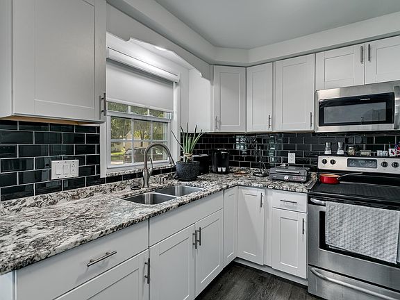 Stylish backsplashBright family roomCompletely remodeled kitchenLarge picture windowRec spaceStainless-steel appliancesNew flooring