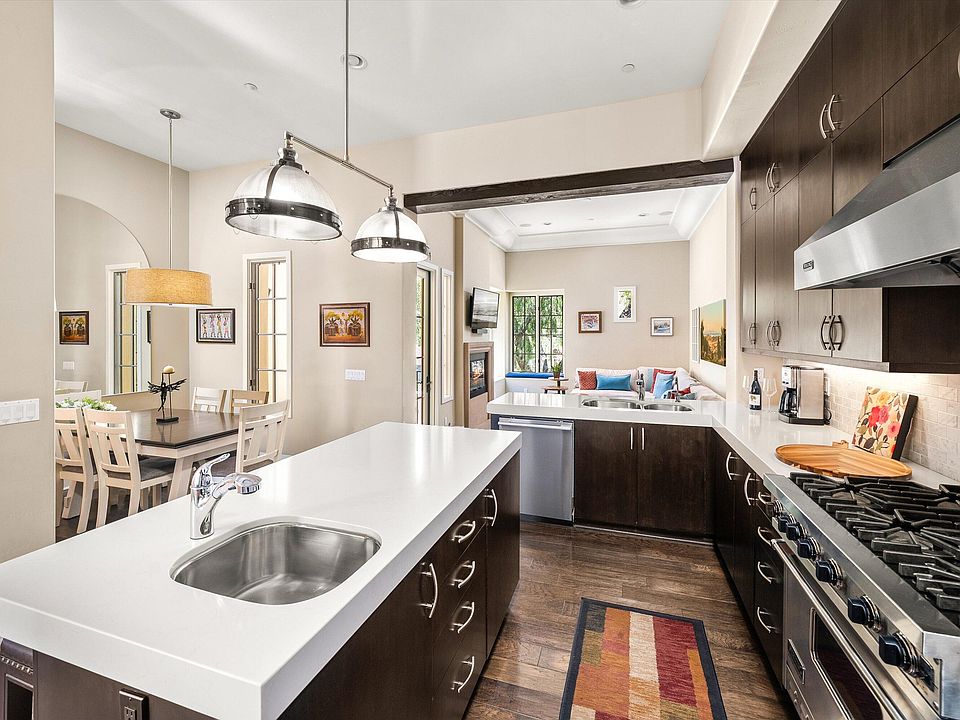 JUST REDUCED! Incredible opportunity to experience refined downtown living in this exquisite Santa Barbara retreat. Step through the private gated entry into La Aldea, an exclusive enclave of just five luxury residences offering the perfect blend of tranquility and sophistication in the heart of the city. This beautifully designed tri-level condo features three spacious bedrooms and three full baths, ideal for both relaxing and entertaining. The entry level offers a private guest suite or dedicated office space with a full bath—perfect for visitors or working from home. On the main level, 12-foot ceilings and an open-concept floor plan create a bright, expansive atmosphere. The chef's kitchen is a culinary dream, with ample custom cabinetry and an inviting dining alcove. The living area extends to a private balcony for alfresco dining. Perfect for enjoying the Santa Barbara ocean breezes. A second guest bedroom and full bath are also located on this level, with its own private balcony for added comfort and charm. The entire upper level is a luxurious primary suite retreat, complete with stunning mountain views and a private balconyan ideal spot to enjoy morning coffee or an evening glass of wine. Additional features include a two-car attached garage and multiple private outdoor spaces for seamless indoor-outdoor living. With its prime location just steps from downtown's vibrant shops, dining, and cultural attractions, this is Santa Barbara urban living at its finest!