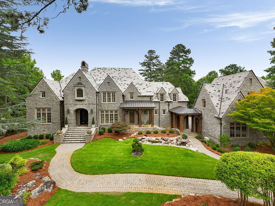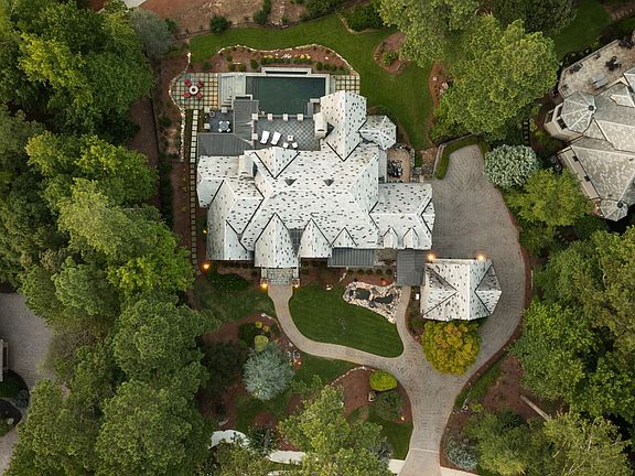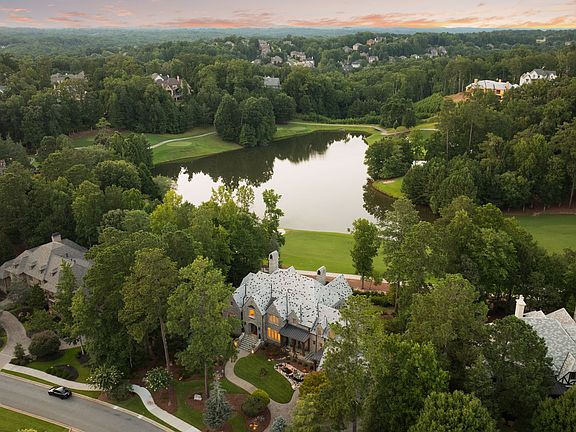 "The Castle" at The River Club" Welcome to The Castle, an extraordinary full-limestone Italian estate where timeless architecture and modern luxury converge. Built with craftsmanship seldom found today, every detail speaks of artistry and purpose-from the rich heart Rocky Mountain pine flooring to the custom, chosen for both beauty and lasting quality. Privately situated in one of The River Club's premier locations, the property captures panoramic views of the 8th hole and shimmering lake. These vistas surround the home, visible from the fireside keeping room, covered outdoor terraces, and the showstopping double infinity-edge pool where water meets horizon. The main floor offers elegant formality and comfortable warmth. The fireside great room, formal dining room, and leather-paneled study exude refinement, while the gourmet kitchen with stone fireplace keeping room invites casual gathering. A breakfast room, artistic two-way walk-in pantry, and guest suite with a steam shower bath complete this level. Upstairs, the owner's suite is a truly Italian-style masterpiece-a sanctuary with a fireplace, coffee bar, private terrace, and intimate loft accessed by its own spiral staircase. The spa bath is crowned by a hand-painted domed ceiling with cherubs, a crystal chandelier above a black soaking tub, floor-to-ceiling stone, heated floors, steam shower, and dual private water closets. The expansive walk-in closet recalls a bespoke European atelier, complete with hidden cedar closet and dressing mirrors. Three additional bedrooms each have distinct personalities: a luxurious cabin retreat with mural, hardwood planks, and metal ceiling; a princess suite in soft purples with hand-painted art; and a sunlit sanctuary in serene tones. The indoor staircase to the terrace level is finished with plush carpet and a hardwood handrail, while outside, a graceful spiral staircase connects the upper terrace to the pool level. The terrace level is an entertainer's haven-a full Irish pub, billiards room with brick flooring, media room with movie theater screen, home gym, steam/dry saunas, and space for a massage area. Another guest suite offers privacy, with decks leading to the pool and outdoor entertaining areas. The property features a two-car attached garage and a two-car detached garage. Above the detached garage, a private retreat awaits-ideal for a golf simulator, gaming, music studio, hobby space, or the ultimate man-cave. Both garages have carriage-style cedar doors and are joined by a paver driveway that adds timeless curb appeal. From coffee on the enclosed porch to starlit evenings on the terrace, The Castle is more than a home-it's a lifestyle of elegance, craftsmanship, and enduring sophistication.