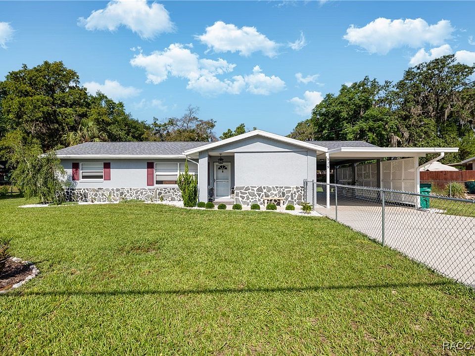 Updated & Ready for you! This lovely, 2/1.5 with carport, concrete block/stucco home sits on .34 acres! Completely fenced with double gate entrances, 2023 roof, 2019 HVAC, 2023 washer/dryer, new stainless appliances, new sliders, kitchen window, & entry doors. All tile floors, updated 42” cabinets w/ granite countertops, tile backsplash, deep double sink. Center granite island is 6’8” long with breakfast bar seating! Sliding doors lead to a 20’x12’ screened lanai offering a beautiful view of the professional landscaped yard w/ 2 sheds for storage/workshop & even an outdoor shower. Both bathrooms updated, tile walk in shower (the half bath has room to add a shower! Your kitchen opens to the 17x14 living w/room/dining area which leads to your 16’ x 10’stepdown family /bonus room. The attached/finished 15’x25’carport offers patio comfort with shade and parking. Outdoor sheds are 29 x 11 with connecting doors inside & concrete pad , the other 2021 shed is 10x16. Outside of home painted 2024. Room for a pool! Sidewalks provide walking & biking! Home has been recently appraised! Amenities within walking or biking distance; Turner Camp Boat Ramp, Whispering Pines Park with pool/trails, Dog Park, Liberty Park, Withlacoochee Trail, Bike Path to Historic Downtown Junction & Farmers Market (1/2 mi), shopping, medical, hospital, 11 mi to Suncoast Pkwy. Make this your year round home or fun vacation home! Inverness was voted one of the Best Small Towns in the South in the 10 Best Readers Choice Awards