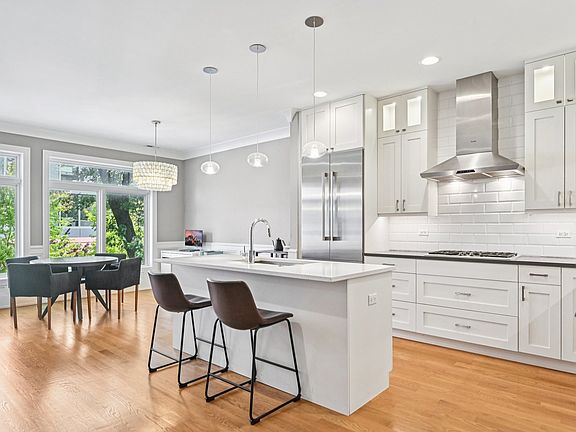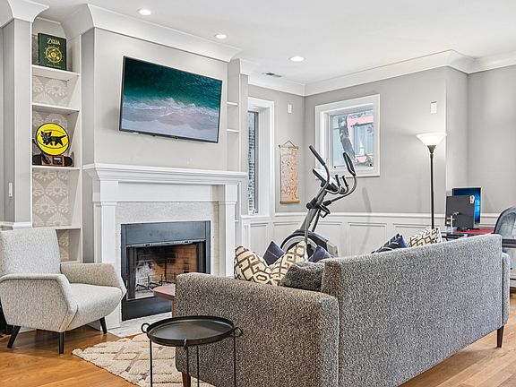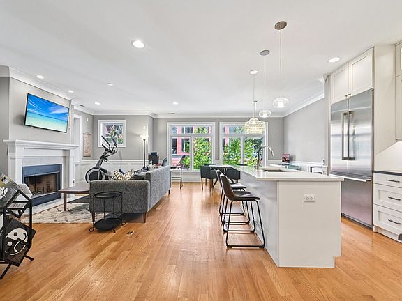 Step into this stunning extra-wide 3 bedroom, 2 bathroom home, perfectly situated on a picturesque tree-lined street in the heart of Lincoln Park. Flooded with natural light, the open-concept layout showcases a spacious living and dining area with a wood-burning fireplace, custom built-ins, and elegant designer details throughout. The chef's kitchen impresses with sleek white cabinetry, quartz countertops, a stylish tile backsplash, breakfast bar seating, and top-of-the-line Thermador stainless steel appliances. The generous bedrooms offer excellent closet space, while the luxurious primary suite features a massive walk-in closet, direct access to a private deck, and a spa-like bath complete with a steam shower, dual vanities, heated floors, and a whirlpool tub. Additional highlights include hardwood flooring throughout, built in speakers, in-unit washer/dryer, and an included garage parking space, as well as additional storage. Unbeatable location-just steps from parks, the Fullerton El, shopping, dining, schools, and endless neighborhood amenities. This home truly has it all!