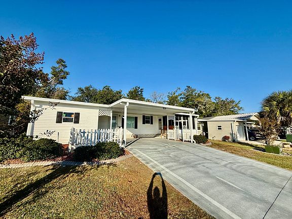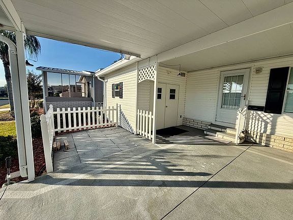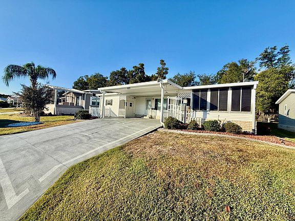 Home is located in Water Oak Country Club Estates an active 55 plus resort style land lease community in Lady Lake Florida. Bright and cheerful, this home is very welcoming. Spacious double driveway and carport provide ample parking. Open patio area is a great spot for your BBQ grill or extra parking for your golf cart. The large utility shed would make a perfect workshop and has double doors for golf cart storage. Comfortable enclosed lanai is great for entertaining or extra living space. Split bedroom open floorplan, provides privacy for you and your guests. Full guest bathroom with tub/shower combo. The large den would make a great craft room or extra sleeping space for guests. The pass through kitchen is spacious and has attractive white cabinetry as well as appliances. Large pantry for storage, as well as plenty of cupboard and counter space. Convenient indoor laundry located just off the kitchen. Your breakfast nook is a perfect spot to enjoy your morning coffee and the full dining area opens up to the comfortable living room. the primary bedroom is large and the en suite bath has double sinks and a beautiful updated walk in shower. Ceramic tile in the kitchen and vinyl plank flooring in the main living area's as well as the primary bedroom. The guest bedroom has beautiful, brand new carpeting. Conveniently located very close to the resident back gate to the community as well as the satellite clubhouse and amenities. An absolutely stunning resort style third pool for the community is almost complete! This is a home to be proud of! Water Oak is a premier active 55+ land lease community in Central Florida. A peaceful community with rolling hills, historic trees, and a newly renovated 18-hole championship golf course. Enjoy a gated community that mows your lawn as you live a resort lifestyle with two beautiful clubhouses, heated pools, a sports center, a restaurant, and a variety of clubs and activities. Call to see this home today!