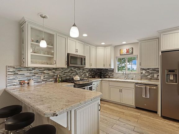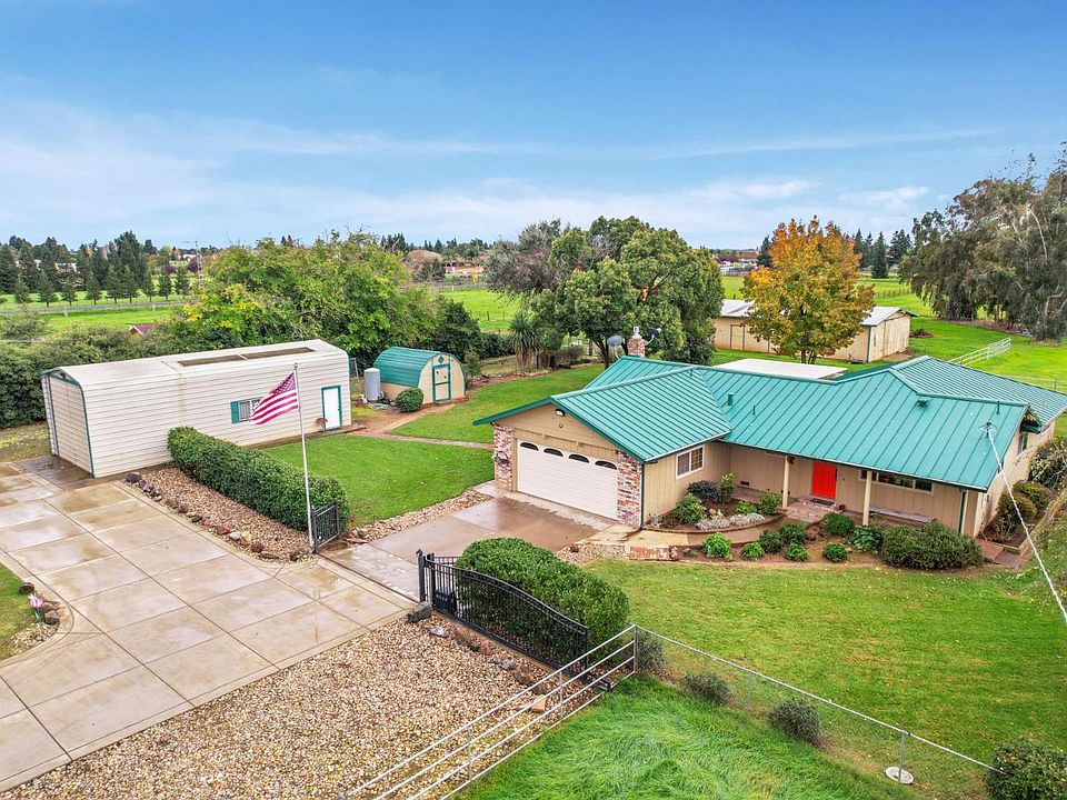 Welcome to this beautifully remodeled country charmer set on 5 fully fenced acres, complete with a circular driveway and room to spread out. This property is truly a retreat, featuring an 8-stall barn, a 40' x 17' shop, and a separate storage shed perfect for horses, hobbies, or equipment. Inside, the home has been tastefully updated. The kitchen shines with granite counters, a GE appliance package, and a comfortable eating bar. Luxury Tile flooring flows throughout, and a cozy gas fireplace adds warmth and character. The home offers 3 bedrooms and 2 bathrooms, including a remodeled primary bath. You'll also enjoy peace of mind with a newer HVAC system, newer water heater, and a durable metal roof. A large covered patio overlooks the property, creating an ideal spot for morning coffee, evening sunsets, or outdoor entertaining. The property is equipped with leased solar. Country living with many modern updates!