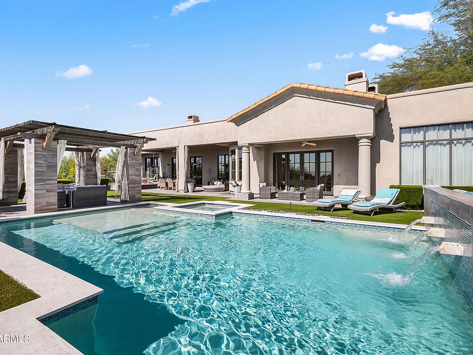 Nestled in the prestigious guard-gated community of DC Ranch, this stunning single-level home offers the perfect blend of luxury and comfort. Enjoy breathtaking sunsets from your resort-style backyard featuring a custom heated pool and spa with water feature, multiple areas to dine and entertain, built-in BBQ station, covered patio with misting system and heaters, plus a ramada with gas fireplace. Inside, an open-concept floor plan showcases a great room with fireplace, built-ins, and French doors to the backyard. The chef's kitchen includes two islands, high end appliances, multiple ovens, wine fridge, sunny breakfast nook, and adjoining family room with fireplace and custom cabinetry. Retreat to the primary suite with sitting area, spa-like bath, freestanding tub, oversized shower, dual vanities, and custom walk-in closet. Located just steps from DC Ranch Country Club, Market Street's dining and shops, and miles of scenic hiking and biking trails, this home places North Scottsdale's finest amenities at your doorstep. Residents also enjoy easy access to world-class golf, top-rated schools, and vibrant community events.