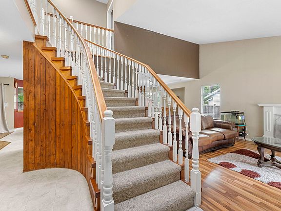 Ceramic tile foyerVaulted ceilingsElegant curved oak staircaseSpacious primary bedroomWalk-in closetCozy gas fireplaceComfortable family room