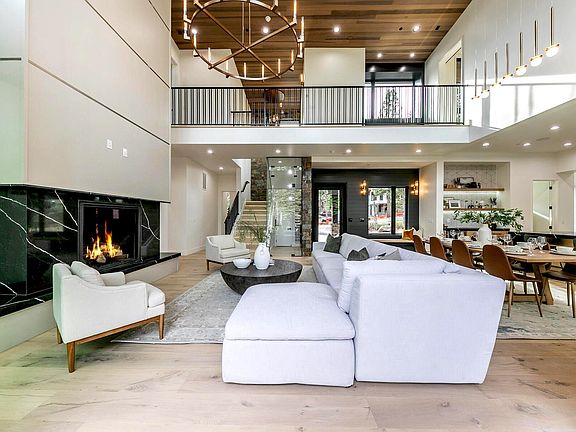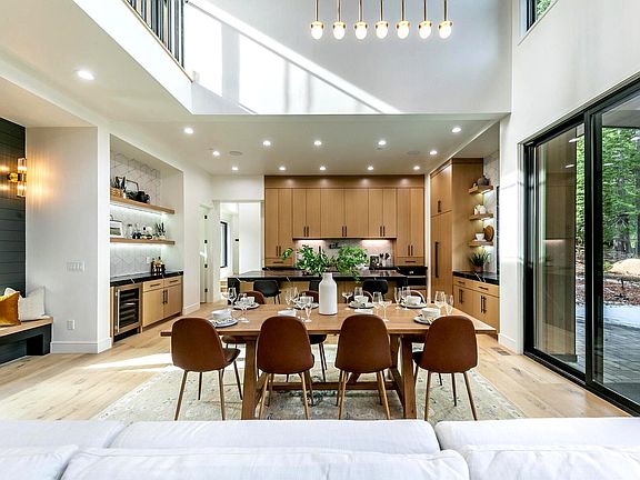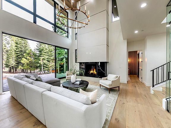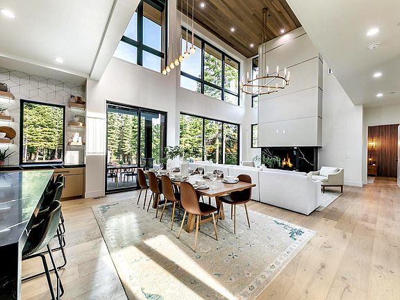 Experience the pinnacle of mountain modern living in this breathtaking 4 bedroom, 4.5 bathroom brand new construction home on a premier lot just behind the 14th hole tee box at the Schaffer's Mill award-winning golf course. Black metal and clear cedar siding are complemented by natural stone to create an inviting exterior, providing a preview of the meticulous craftsmanship within. Step into the breathtaking great room, where 22’ cedar ceilings soar above a 126-bottle wine display room and two-story fireplace with black quartz surround to form the perfect backdrop for memorable dinners, game nights, and holiday celebrations. The kitchen is an entertainer’s dream, with custom white oak cabinets, Jenn-Air appliances, a wine fridge, built-in bar, walk-in pantry, and sleek waterfall island. On the main level, dual primary bedrooms offer spaces to retreat after a long day on the slopes, each adorned with gas fireplaces, sleek panel accent walls, and luxurious en-suite bathrooms. Beautiful natural stone and elegant LED lighting beckon you up the stairs to a cozy den area with built-in entertainment center, a spacious bedroom ideal for a bunk bed setup with balcony, and additional secondary bedroom with attached bathroom. Outside, enjoy your morning coffee on the covered patio, or roast s’mores and sip cocktails with family and friends around the fire pit, listening to music through the exterior surround sound system with beautiful wooded views. Every detail has been thoroughly considered and no expense was spared, with highlights such as wide plank European white oak floors, central air conditioning, a two-car epoxy garage, an alarm system, Andersen windows & doors, and a spacious laundry room. Beyond the property, Schaffer’s Mill offers world-class amenities including a championship golf course, fitness center, clubhouse, resort-style pool, tennis court, and the acclaimed Sawyer Restaurant. With a convenient shuttle service to Northstar Ski Resort, and its proximity to historic downtown Truckee, and the region’s premier hiking and biking trails, this residence truly encapsulates the epitome of luxury mountain living.