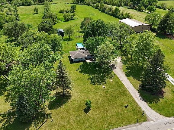 Love the country but don’t want to be isolated? Check out this 4.8 acres and find exactly what you are looking for. This ranch home, with 1560 sq ft on the main floor, with 2 baths and three bedrooms. There is LVP flooring throughout the main living area, an updated eat-in kitchen with an amazing island, both a living room and a den, a formal dining room, a ¾ bath, and doors to the garage and basement complete the main floor. Step out the sliding glass door onto the deck that overlooks and connect to the above ground pool. Beyond the pool is the chicken coop, the 25’ X 32’ pole barn, and the rest of the 4.8 acres going back to the tree line on the other side of the hill. Given the fencing, the property is perfect for horses, goats or other livestock. The chicken coop currently holds 14 hens and can come with the house. The lower level, also 1560 sq ft, can be finished to meet additional need for space, and does currently have a non-conforming bedroom. The steel I-beam wall bracing comes with a transferable lifetime warranty.