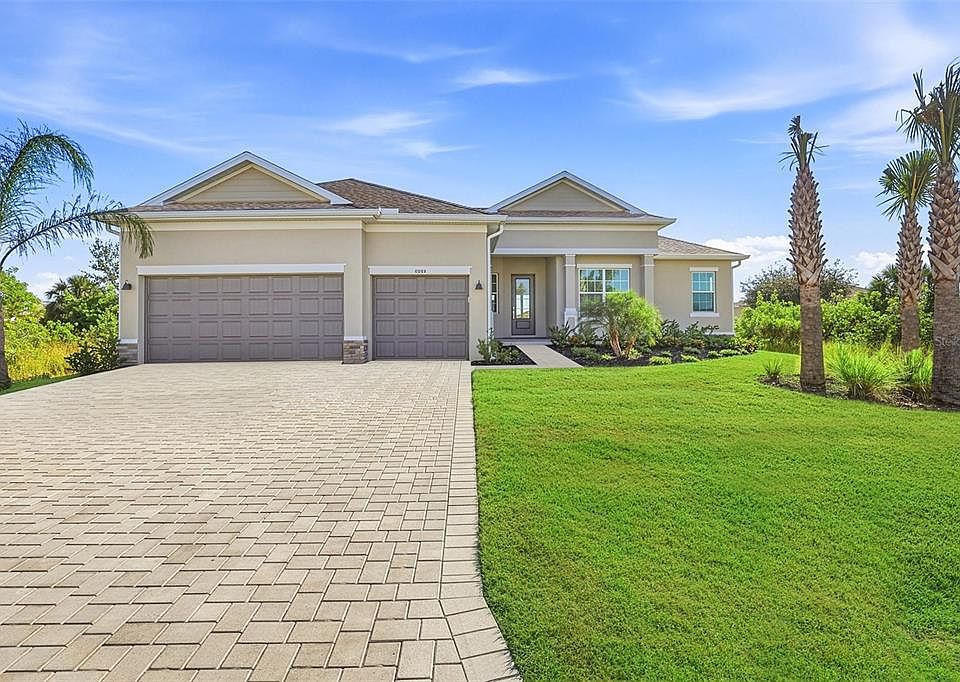 THIS HOME IS READY FOR YOU NOW!! The Oakmont II is a split-bedroom floor plan with 2,361 square feet of living space home featuring 3 bedrooms, a den and 2.5 bathrooms. The Owner's suite boasts a large walk-in closet, dual vanities & sinks, soaker tub and separate shower. The kitchen with breakfast nook is open to an expansive great room that transitions seamlessly to the covered lanai. 3-car garage for storage of the family’s biggest toys. Additional options include quartz countertops, porcelain tile throughout, upgraded cabinetry and appliance package. Rendering, photos & virtual tour are of like model and are used for display purposes only