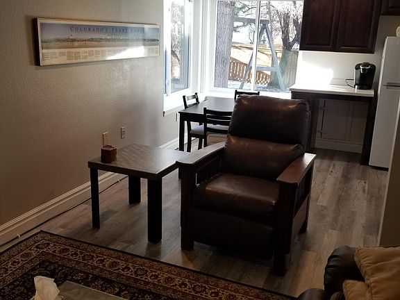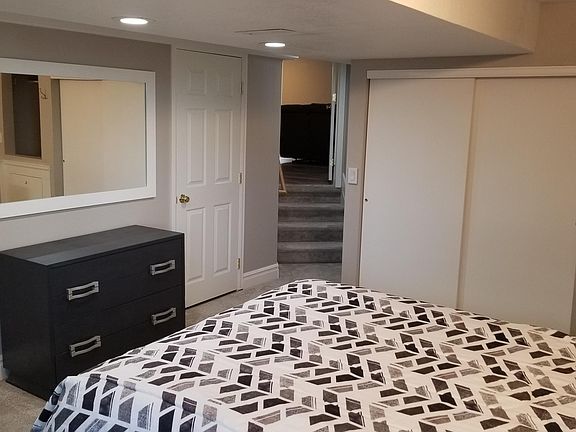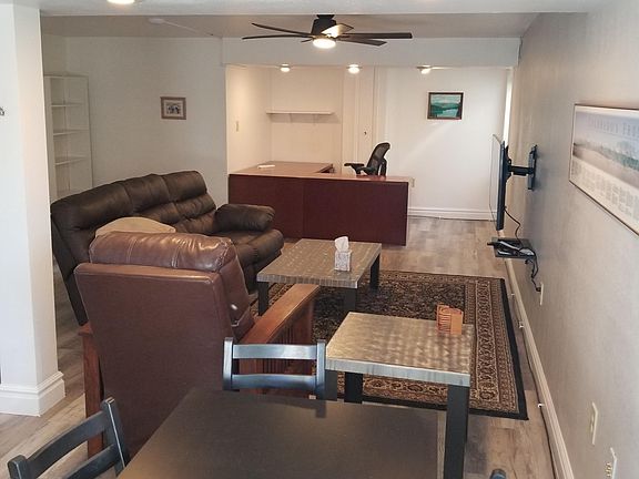 Well lit nicely furnished multi-level walkout basement apartment with private entrance, newer appliances, available until June 15th, 2021. Unit is part of private home in beautiful residential neighborhood near large open space and park. Approximately 900 Square Feet. Kitchen, Dining, and Bedroom areas all have large windows allowing for plenty of natural light. Living Room has leather furnishings with recliners, 43" Swivel-Wall Mounted TV with latest apps, ceiling fan, storage areas. Office area has executive desk with professional office chair, perfect for remote workers, students or crafts. Efficiency kitchen has a sink, hotplate, toaster oven, microwave, Keurig coffee maker, refrigerator, dishwasher, full suite of dishes, silverware, cooking utensils. Combo Washer Dryer. Queen sized bed and multiple dressers, large closet space. Towels, blankets, and sheets provided. Bathroom has large vanity with 8 drawers for storage. High Speed Internet. Antique Wood Vinyl Flooring in living areas with plush carpeting in the bedroom. Dog Door for medium / larger dogs.