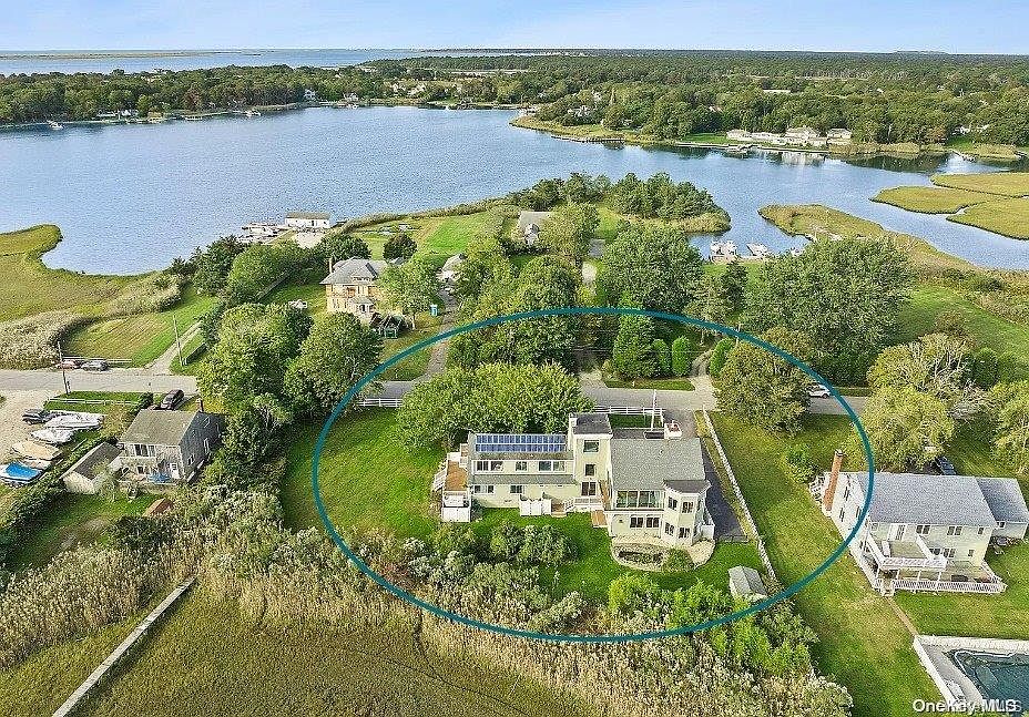 Impeccably renovated from top to bottom, this stylish four-bedroom contemporary is located on the water in East Moriches with a private dock. No expense was spared on this gorgeous light-filled 4400 square foot home, which boasts two fireplaces, a massive open kitchen with 40 square foot quartz island and expansive 180-degree water views.  The open plan provides for sizable and distinct living and dining areas. The kitchen is a chef's delight with stainless steel appliances including a 6-burner gas range, slide in hood, and oversized sink. Custom shaker cabinetry is topped with quartz counters offering plenty of room to entertain.  In addition to the wide-open layout in the Kitchen/Living Room/Dining area, this sun-drenched home features a separate family room and office-loft as well as a two-car attached garage and driveway that fits six cars.  The large, wrap-around side and backyards feature an irrigation system, new landscaping, and leads to private dock with access to Moriches Bay. In addition, don't miss the gorgeous botanical Japanese cherry collection in the front yard.  This home is equipped with central HVAC, solar power, a finished basement, walk-in closets and walk-in laundry room., Additional information: Appearance:Excellent