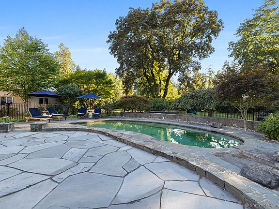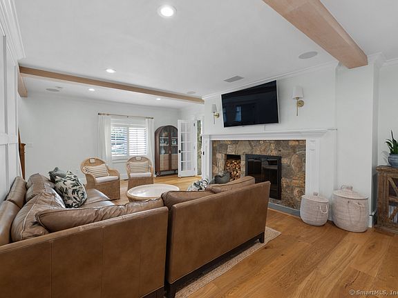 Your search for historic charm and modern luxury in South Wilton ends here. This 1935 Frazier Peters-designed stone and shingle home was thoughtfully expanded by JPL Architects and fully rebuilt in 2020-2021. Set on a flat acre in the sought-after Meadows neighborhood, this home offers 4 bedrooms, 3 full baths. The house has been completely updated while preserving its original New England charm. The chef's kitchen features Sub-Zero and Viking appliances, quartz counters, and built-in breakfast nook. The formal dining room showcases the original stone facade with beautiful landscaping views, while the family room centers on the wood-burning stone fireplace with oak beams. The sunroom with office alcove overlooks the koi pond. Out back, the bluestone patio opens to views of the gunite pool with bluestone terrace, and spacious storage shed with concrete foundation. The rebuild includes raised ceilings, new windows, propane HVAC w/ Ecobee thermostats, plus new electrical, plumbing, roof & siding. Upstairs, the primary suite features a fireplace, radiant heated marble bath with soaking tub and shower, and dual custom walk-in closets. Three additional bedrooms, hall bath and laundry complete the second floor. New 5-bedroom septic offers potential for in-law apartment over the garage. Automation includes surround sound and hardwired video security system. Premium finishes include wide-plank white oak floors and custom millwork throughout. Just 10 minutes to Westport train & center