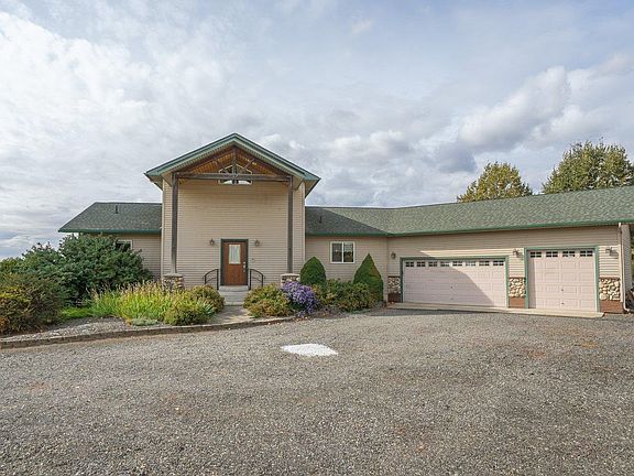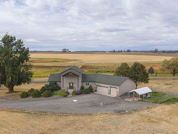 Impressive home with panoramic views on 9.14 acres, with 5 acres fully fenced and a 3-car garage. Inside, soaring ceilings and a striking log staircase create a dramatic centerpiece, while expansive windows frame territorial scenery and wildlife sightings. Main-floor living offers 2 bedrooms and 2 baths, a great room with custom stone propane fireplace, plus a dining area that flows into a spacious kitchen with granite counters, stainless appliances, and center island. A large, well-appointed laundry area is also on the main floor for added convenience. Upstairs, the primary suite features vaulted ceilings and abundant natural light. The daylight basement includes 1 bedroom, 1 bath, 2 family rooms, and a third bonus space with potential for a kitchenette—ideal for multi-generational living, rental income, or guest quarters. An expansive deck extends the living space outdoors, perfect for taking in the panoramic views. Plenty of room for animals, gardens, or future outbuildings—all just minutes from Spokane.