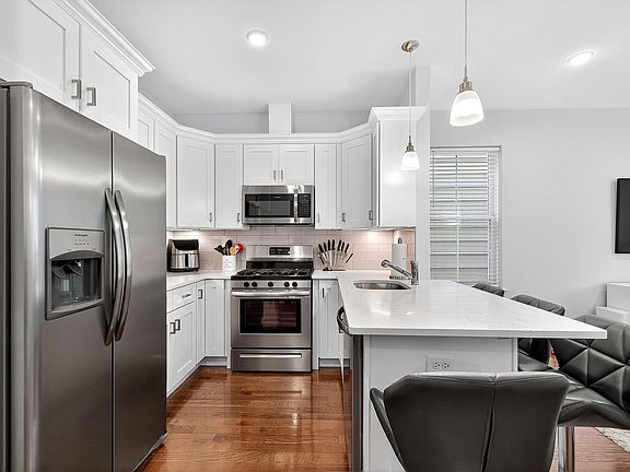 The owner's duplex spans two levels and includes three bedrooms and three full bathrooms. Designed with both comfort and versatility in mind, it features a formal living room and an additional family room, creating multiple spaces for entertaining and everyday living. The gourmet kitchen is appointed with quartz countertops and designer tile finishes, while the expansive master suite includes a walk-in closet and spa-inspired bath with a glass-enclosed shower. Gleaming hardwood floors, in-unit laundry, and abundant storage complete the home's thoughtful layout.