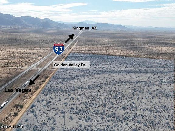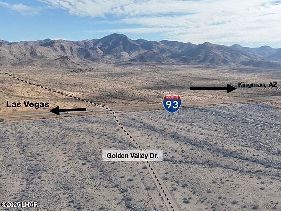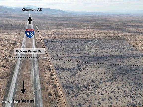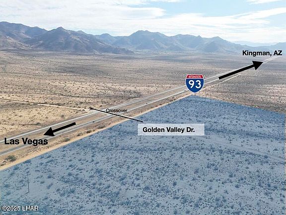 Rare 81+ acre opportunity along the rapidly growing Highway 93 corridor—soon to become Interstate 11. These two parcels, 339-40-002 (40.55 acres) and 339-40-003 (40.45 acres), offer a combined 1,698.24 feet of prime Highway 93 frontage with hard-corner access at Golden Valley Drive, one of the few designated highway turnoffs and crossovers in this entire stretch. The location provides exceptional ingress/egress and makes the site ideal for a gas station, truck stop, travel center, RV resort, industrial yard, or large commercial development. The property is currently zoned AR-36, and Mohave County has indicated support for a commercial rezoning due to the highway frontage, corner access, traffic flow, and strategic position along the future I-11 alignment. Electricity and phone are already on the property, and both parcels feature level terrain with expansive mountain views. Seller will sell parcels separately or together, and each parcel individually offers its own Highway 93 and Golden Valley Drive corner. This is one of the most unique and high-visibility properties available between Kingman and Las Vegas, positioned perfectly for future commercial growth.