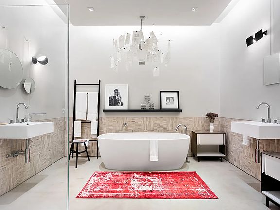 The large and inviting living area, with a large drop down projector, flows seamlessly into the open kitchen with Viking and Sub-Zero appliances, custom millwork, and a large island. The dining area with space for a 16-person table is perfect for entertaining. In the primary suite, you'll find a custom walk-in closet and five-fixture bathroom. The secondary bedroom, perfect for guests or a home office, features a custom-built wood slab desk overlooking Mercer Street. A Lutron lighting system, electric blackout shades, washer/dryer, and semi private landing complete this iconic Soho loft.