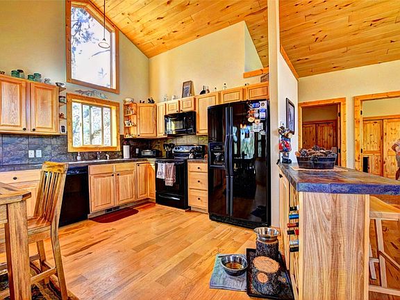 This stunning cabin is situated on 2 secluded acres, offering breathtaking views. With over 2000 square feet of space, it features 3 bedrooms and 2 bathrooms. The interior boasts vaulted tongue and groove ceilings, a spacious kitchen, and a custom rock fireplace. Hardwood floors add a touch of elegance, while the wall of windows allows ample natural light to flood the rooms.