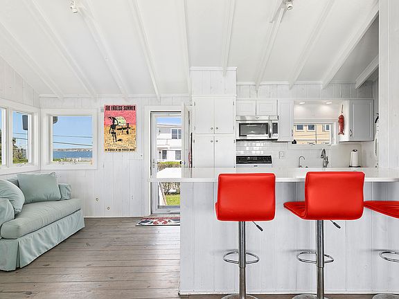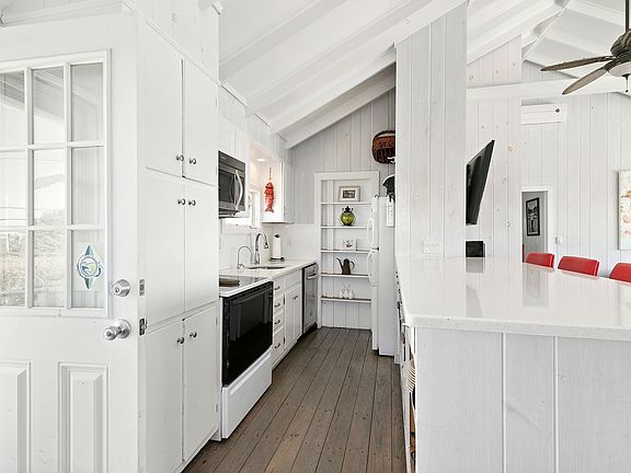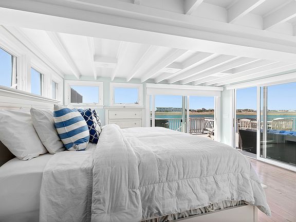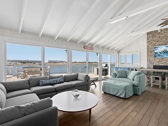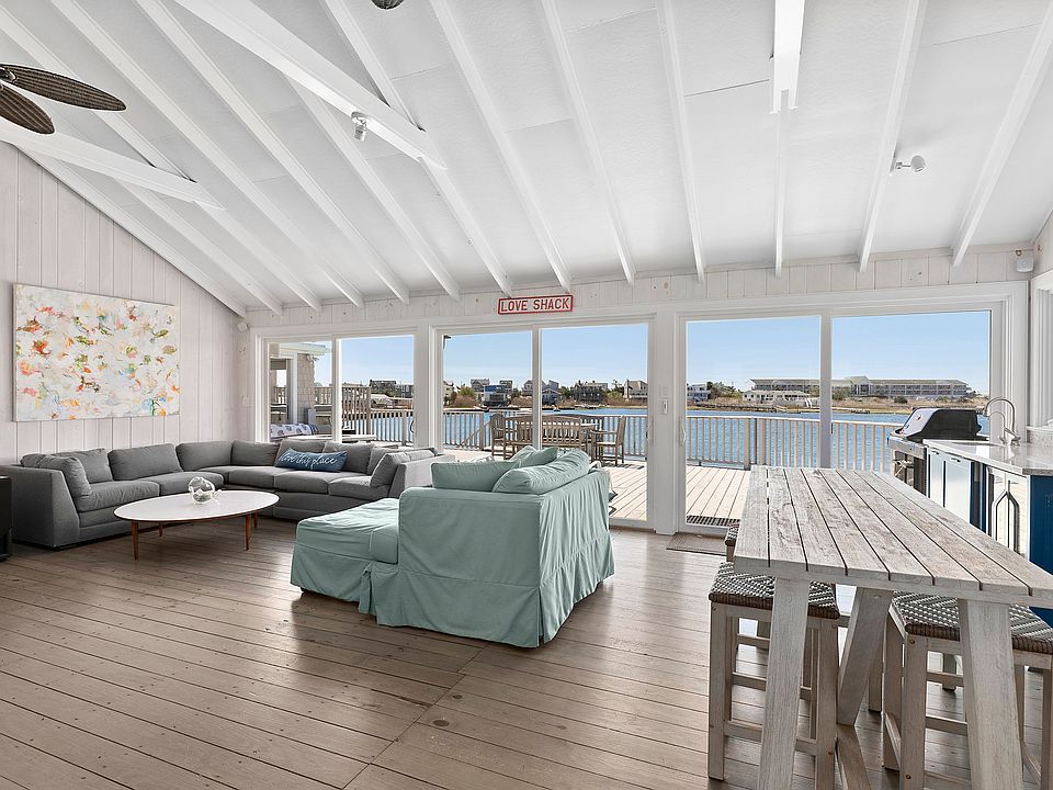 Waterfront paradise out your back door. Enjoy breakfast in the updated kitchen & spacious living area with its unobstructed water views. Dine on the large back deck with fire pit, comfortable seating area & large hot tub overlooking the bay. Launch a paddle board, kayak, or raft from your own floating dock. Or if you prefer, the beautiful white sand beaches on the Atlantic Ocean are a few blocks away. Nearby Dune Road is - a popular route for early morning walkers, cyclers, runners, & birders & nearby Main Street is alive with its outdoor restaurants, shops, farmers market & the WHB Performing Arts Center. This updated 4BR bay front comfortably sleeps 10 (king, two queen, two bunks), with two baths, large living space & adjoining kitchen. Granite topped bar area w/wine refrigerator & second dishwasher make deck side entertaining convenient. Back deck fire table & BBQ. Bulkheaded sand area w/wood burning fire pit. Enclosed gated front yard with hammock, washer/dryer, smart TVs, internet