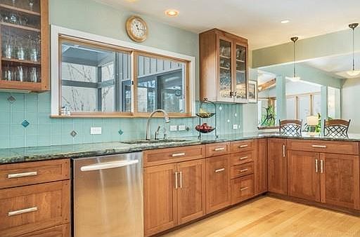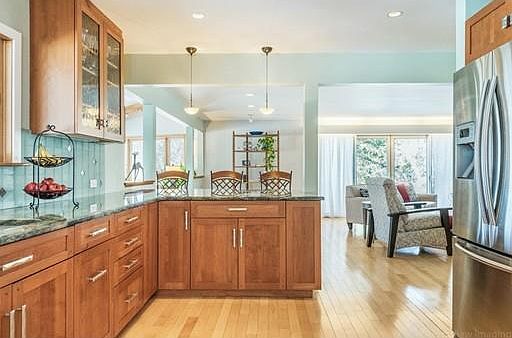 - Kit Dscrp: Flooring - Hardwood, Countertops - Stone/Granite/Solid, Cabinets - Upgraded, Breakfast Bar / Nook, Stainless Steel Appliances, Open Floor Plan, Recessed Lighting, Remodeled, Gas Stove, Lighting - Pendant