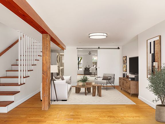 The upper level features two bright bedrooms plus a versatile third room, which could be used as a nursery or home office. A modern full bathroom with contemporary finishes completes the level. The flexible lower level offers a second living space-perfect as a den, media lounge, or recreation room-along with an additional bedroom or expansive home office. A full bathroom, full-size washer/dryer, and direct garden access provide comfort and convenience.