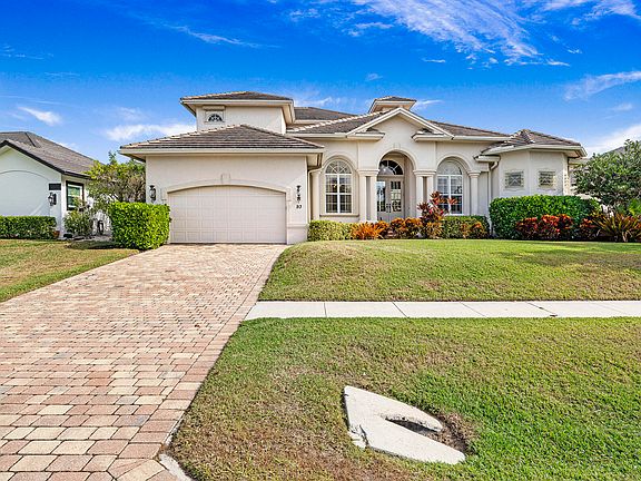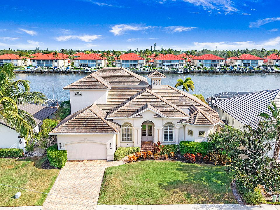 93 S. Seas Court is a centrally located 4 bedroom, 4 bath waterfront home with a half bath, den, and fantastic views of a wide bay. Interior features include a luxurious master bath with walk around shower, 2 water closets and separate jacuzzi tub. Kitchen has custom wood cabinetry and granite counter tops, tile flooring in all common areas. 2 bedroom suites down, and 2 suites upstairs with full baths. Both bedrooms go out to a large balcony. Exterior amenities are a large covered lanai. heated pool and spa. Large dock with a 12k lbs lift. Seawall is 2004. Brick paver driveway, and pool deck.