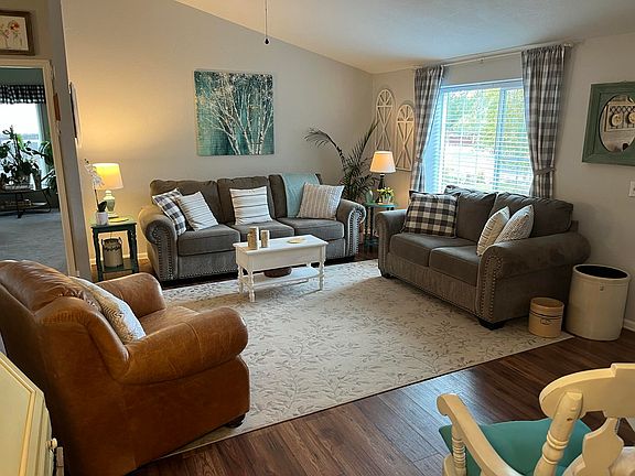 Maintained, upgraded and affordable. This three bedroom two bathroom manufactured home with two car garage, large primary bedroom, vaulted ceilings, fenced yard with sprinkler system and covered patio is just what you have been looking for. Stay warm in the winter and cool in the summer with upgraded heat pump. Newly replaced roof and stainless appliances. Yard is landscaped and has a garden shed for extra storage. Room for RV parking included. Schedule your showing today.