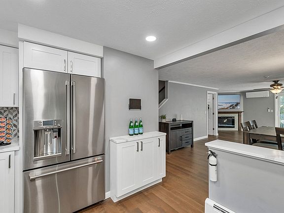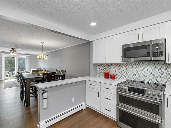 Upscale seacoast home! This luxuriously updated 2-bedroom, 1.5-bath condo. The main floor features a kitchen quartz counters, new cabinets, marble backsplash and Cafe appliances including a double induction oven. Open concept dining/living area with electric fireplace. Private deck. A powder room with updated vanity and plantation shutter. Gleaming hardwood floors throughout! The spacious primary bedroom with direct access to a full bath with soaking tub, porcelain tile walls, marble floor, cabinets with double vanity and quartz counter. Second bedroom with an oversized closet. Updated laundry area. Year round comfort and efficiency with 3 mini splits with heat pumps for heat and cooling. Soundproofing walls on both sides on both levels. Garage with bonus room. Well managed condo with in-ground pool, allowance for two pets. Under 2 miles from Hampton Beach, easy commuter access and near local attractions. Pre-inspected. Showings by appointment.