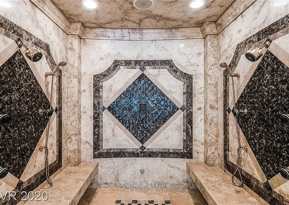 Behind private perimeter gates with a total of approximately 20,000 square feet of living space on three levels, the home includes a 3,000-square-foot, main-level master suite, a fitness center, elevator, grand staircase, massive wine storage room, impressive bar and game room, and a kitchen that boasts island seating space and a disappearing central column featuring multiple television screens. The perfect offering to suit a large family with 9 bedroom suites and 12 bathrooms, the compound will accommodate gatherings for reunions, social events, and more. The property also features garage space for 10 vehicles and would serve the needs of a serious collector or hobbyist. There are numerous "hideaway spaces" both indoors and out, enticing patios and balconies, "window walls" with below-level pool views as well as a private putting green and both golf course and lakefront frontage. There are also distant desert views. This home is a rare opportunity, and an architectural masterpiece!