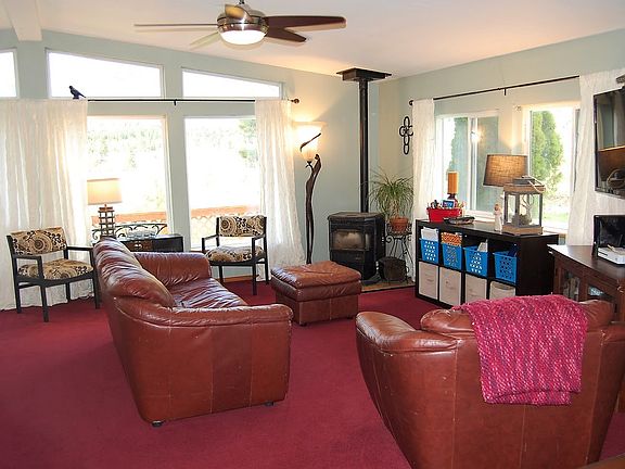 Priced Reduced. Great location, 3 bed/2 bath home is sitting pretty on almost 4 acre just off county road. Garden area, greenhouse, chicken coop, sprinkler system & security system. Enjoy the relaxing yard w/many flowers. Double car garage, RV outlet next to garage. Large master bedroom w/jetted tub and shower & full guest bathroom. Living room features a wall of windows to enjoy the excellent views, vaulted ceilings & pellet stove. Plenty of room for pets. Back up generator included.