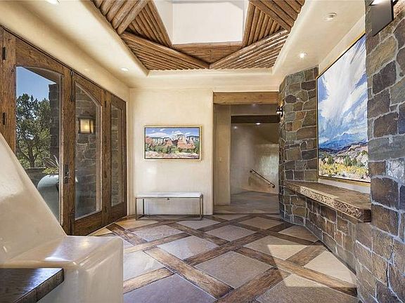 One of the most extraordinary estates in all of Santa Fe, this exquisite 7,700 square foot house and guest house with stunning Jemez Mountain views is sited to perfection overlooking the 14th green on the Sunrise Golf Course within the master planned community of Las Campanas. Designed to celebrate the ultimate Santa Fe lifestyle, this Rastra and Pumice Crete-constructed estate was built and updated with the highest level of luxury finishes, which impresses with superior custom craftsmanship and offers an incredible outdoor living experience with vibrant landscape, a rare viewing deck with a fireplace, and surround outdoor entertainment areas, complete with outdoor fireplaces, and a built-in BBQ, all of which overlook the golf course and views. The 5700 square foot main house offers excellent separation of space with 3 bedrooms/5 baths + office/media room, with a dedicated wine room and a 2-car garage. Guests enjoy full independence with a spacious detached, 2,000 square foot, 2 bedroom/2 bath guest house, complete with a full kitchen, spacious living room, and a 2 car garage. Design features include a welcoming private driveway with custom pavers, a dramatic front entrance which beautifully captures the views upon entering the main house, a recently updated designer's island kitchen with state-of-the-art appliances and an expansive formal living room with stunning views, grand fireplace and portal access. Located off the main living room and kitchen is the spacious formal dining area and an intimate seating area, also with views and portal access. The private owner's suite delights with views, fireplace and a newly updated spa-like bath with natural stone counters, tranquil soaking tub with an elevated fireplace, walk-in shower, dual vanities and closets. Separate from the main living area, within the main house are 2 guest bedroom ensuites, which share their own living room. This epic home is a rare offering and represents true Santa Fe luxury with sophistication.