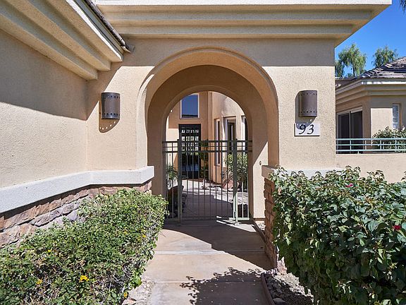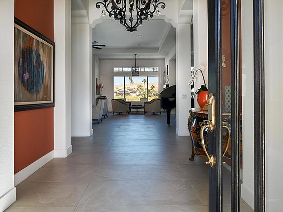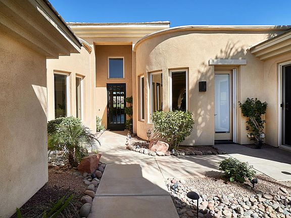 Be sure to click on immersive interactive virtual 3D tour! Beautifully remodeled Contemporary home with a touch of glam in Mira Vista at Mission Hills! Private front courtyard leads to beveled glass front door. Step inside into a Dramatic rotunda formal entry way! Straight ahead is the huge and bright Great Room with soaring 12 ft coffered ceilings, transom windows, and views! - So much to gaze at - your own beautiful spa and pool with terraced rock waterfall, the green of the Gary Player golf course fairway, the serene lake, or the Santa Rosa Mountains. To the left is the Formal dining room with built-in cabinetry and access to your redone kitchen with new appliances, a generous island with bar seating, a glam coffee nook, and two-toned woodgrain and white cabinetry. Living Room has a conversation alcove next to a double-sided fireplace. Redone luxurious bar in black with a touch of gold for entertaining. An office area with built-in wall length desk and quartz countertop with the same incredible views as the living room. Primary bedroom retreat with 2 walk-in closets and a resort like bathroom with gorgeous tile design with soaking tub, separate shower, and water closet. 2 Guest bedrooms each with their own bath and their own access to the front courtyard. Large format tile throughout entire house. Recently installed 29 Owned Solar panels est @ 19,644 kWh and 2 new AC units!