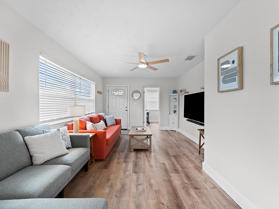 Welcome home to your newly renovated, fully furnished Magnolia Heights Hideaway. We love pets, but this is a pet free zone home. Prepare to be amazed by this hidden gem in St. Petersburg, Florida! This home has 2 Bedrooms, 2 bathrooms and a 3rd bonus room that is currently set up as a home office/guest bedroom. There is a trundle bed that can be used as 2 twin beds. The home is equipped with TV's throughout, extra towels, linens, coffee maker, and basic cleaning supplies. There is plenty of room for entertaining indoors and out. You can unwind in the fenced in back yard with hammocks, shade and an outdoor dining deck with grill to enjoy Florida's year round sunshine. A detached garage and off street parking provide plenty of room for multiple vehicles. Everything you need is included whether you want to make this your long term residency or a winter/summer retreat.