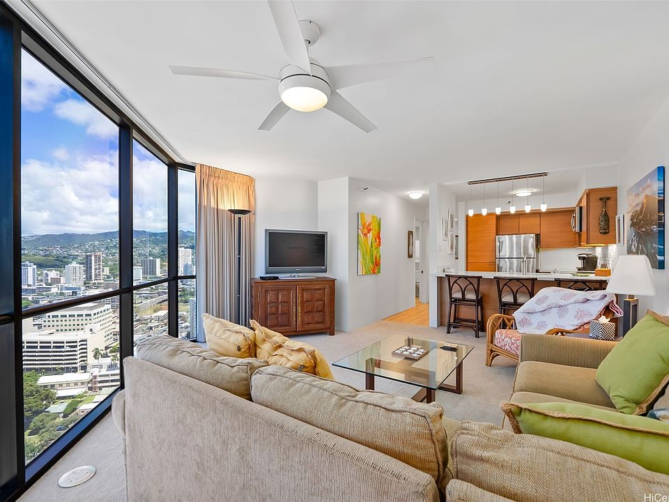 Welcome to elegant convenience with a view at Hale Kaheka. This 1 bedroom/1 bath unit on the 35th floor enjoys floor to ceiling sunset and city views that span mountain to ocean. It was recently renovated with beautiful custom cabinetry, upgraded fixtures and is completely ready for you. Centrally located and close to eateries, Ala Moana Shopping Center and the beach, you also have quick access to the freeway. The fully secured grounds are graced with a koi pond, walking paths, pool, whirlpool, pavilion and barbecue. Built in 1982 it is fully equipped with sprinklers, ac’s and one dedicated parking stall. A wonderful place to call home. 2025-26 ins. coverage has been updated!