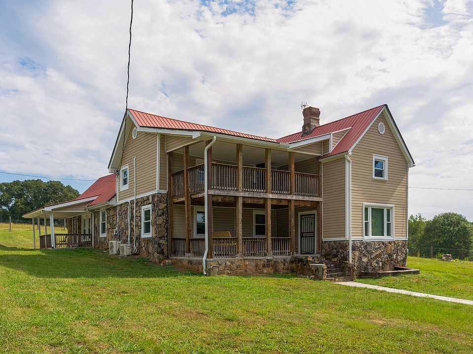 At its center stands a delightful 3 to 4 bedroom, 3 full bath farmhouse built circa 1900, featuring a captivating partial stone exterior, a double-decker front porch, and a side covered patio—perfect for soaking in the serene beauty of the sprawling landscape. The home's interior boasts rich hardwood floors, multiple mini-split systems for comfort, and a traditional floor plan designed for family gatherings and entertaining.