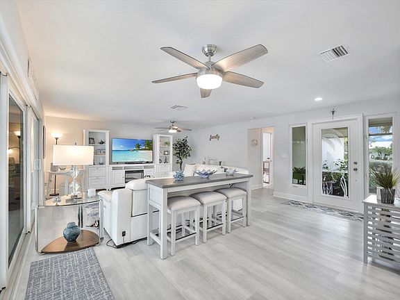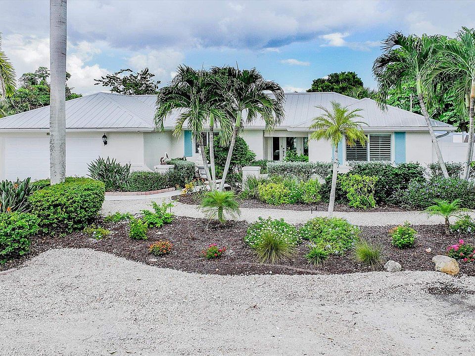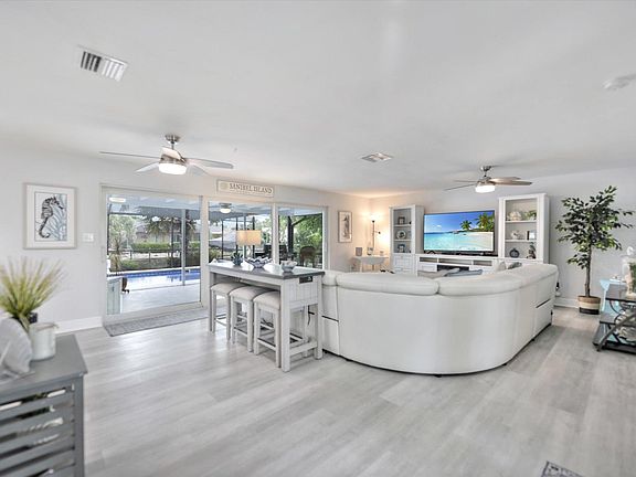 Welcome to this beautifully designed and coastal inspired canal home on Sanibel Island. A perfect east end location which is nestled on a wide canal with quick access to the Gulf of Mexico. This gorgeous open concept floor plan offers the ultimate in island living. A perfect for a vacation home or full time living residence! You will love the spacious and inviting family room, soothing primary bedroom with the spa like bathroom featuring a walk-in shower and free standing bathtub, two comfortable and private guest bedrooms, well-appointed guest bathrooms, good storage and a two car garage. Fully updated including all impact windows and doors, a newer metal roof, new A/C and tropical landscaping. The custom kitchen offers a large island, lots of cabinets, Quartz/grantie countertops, stainless appliances, and a separate dining room for entertaining. Every detail of this home has been thoughtfully planned Step outside to a refreshing pool, large screened lanai, and a delightful dock where your neighbors are dolphins and manatees. A short walk to the beach or park in the deeded beach parking lot. Sanibel is known for it's fabulous bike paths, boating & water sports, world class shelling, white sandy beaches, azure waters, themed restaurants, quaint shops, abundant wildlife, and a quiet, low-key atmosphere.