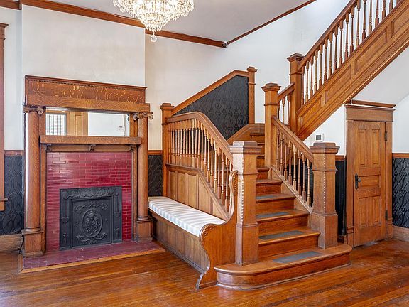 Constructed of solid brick, this two-story home has a partially finished basement and a walk-up attic that runs the entire length and breadth of the house. Slate roof features pyramid and gable details, wood shingled dormer and front gable pediment. A one-story wrap around porch with small Ionic columns, oak & pinewood floors, wainscoting, original mouldings, chair rails in the dining room, high ceilings and transoms are just some of the extraordinary features. Seven fireplaces with each mantlepiece a work of art, feature engraved fireplace fittings and are highlights of the home. The same tiger oak seen on the staircase is used on the floor to ceiling massive pocket doors which give privacy to the parlor and the dining room. Beautiful woodwork carvings and intricate etchings throughout the home demonstrate the quality of workmanship. The foyer of the main floor opens to a sitting area with fireplace and grand staircase. Down the corridor is a beautifully designed kitchen with pantry and new stainless appliances, providing all the modern conveniences. Adjacent is both a formal dining area and a breakfast room. A full bedroom or office space is also available on the main level. Finishing out the main level is a half bath and newly designed added full bath. Four large bedrooms make up the second level along with renovated full bath. The home has been well maintained, refurbished, modernized and is truly show worthy while maintaining all of its old-world charm. Newly finished original hardwood floors, freshly painted, new kitchen and updated bathrooms are just some of the renovations. The original wood trim will amaze you with its beauty and beautifully preserved original details. Storage is never a problem with this home. Basement includes a full bath as well. This is an EXCEPTIONAL home that is both stately and welcoming. With its recent renovations, updated electrical and plumbing, it is ready to welcome its new family.
