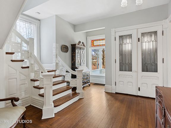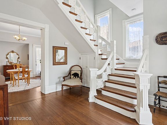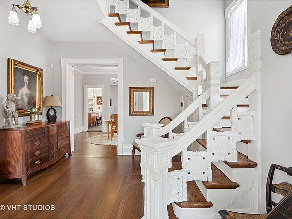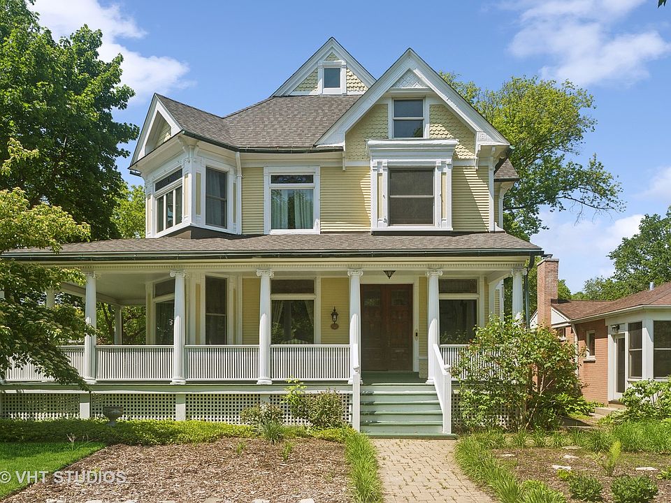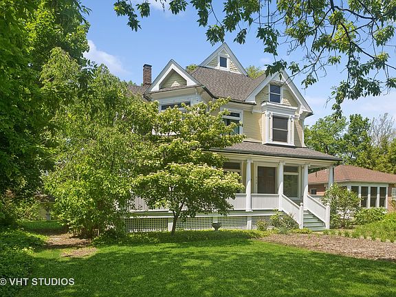 This gorgeous Queen Anne Victorian residence, circa 1880, is situated in the Ridge Historic District in close proximity to downtown Evanston, Main Street shopping, schools and both the CTA and Metra trains for easy commuting. It is a blend of both modern amenities and original details including quarter-sawn oak flooring, crown molding, 9 foot ceilings, stained glass windows, vintage hardware and light fixtures and a wrap around front porch. The first floor features a grand entrance foyer with a carved staircase, double parlor living room with three stained glass transom windows in addition to large picture windows; separate dining room with buffet nook and china closet and a renovated (2019) kitchen with modern appliances including a five burner Bertazzoni stove/oven, oversized central island, farmhouse sink, butler's pantry, heated floor and mudroom. The second floor offers a primary bedroom featuring a private bath with soaking tub and an adjoining dressing room offering additional closet and storage space, or conversion back to a second bedroom; two additional hall bedrooms with a second full bathroom, and a home office. The expansive finished third floor is ideal for a family room, play room, teenager suite or work space. It features vaulted ceilings, separate heat/AC and a full bath. There are three finished rooms in the basement plus a full bath - laundry room, play room, and recreation room in addition to utility/storage room. Enjoy spending outdoor time in the wide lot (78 x 175) featuring a patio, gardens, play space, front yard native perennial gardens (no pesticides used), wrap around porch, a two car garage wired for EV charger and two extra car parking spaces off the alley. Recent improvements: fresh interior painting, updated electrical, new sewer line, new ejector pump, new hot water heater, new Mitsubishi split system on third floor, replaced/repaired exterior portions of porch and trim, entire exterior of home painted, newer roof, new fence, and more! Enjoy touring this lovely Evanston Landmark home! Continue to show during contingency.