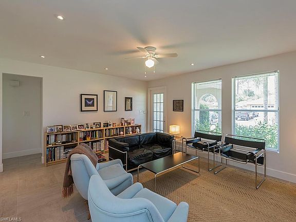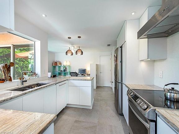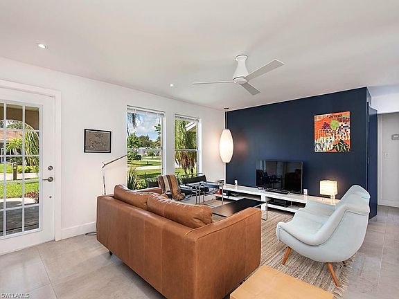 Recently renovated with a new standing seam metal roof, facia, gutters, landscaping, storm rated garage door, and landscape lighting. One of the nicest homes in Flamingo Estates is located on a large corner lot offering space and privacy. This home has been extensively updated and meticulously maintained. Some of the outstanding finishes are; new Porcelanosa Tile throughout, smooth finish plaster interior walls and ceiling, new paint interior and exterior, and solid core doors with Emtek hardware. Fully renovated kitchen and bathrooms including cabinets, appliances, electric and plumbing fixtures, new wiring and pipes, . New alarm system, garage door, sprinkler system and pump, native landscaping, shelving in closets, and much more. All upgrades are of high quality from appliances to the lighting and hardware. Flamingo Estates is only a short distance to downtown Old Naples and the beach. Very central location and within walking distance to several schools. Currently has an annual lease at $2200 per month transfers with the sale of the home.