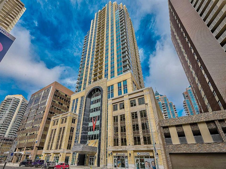 Welcome to this stunning, 1 bedroom, 1 bathroom home on the 33rd floor of one of Calgary's most sought after buildings, Vogue! If you have ever wondered what the downtown skyline and Bow River look like from 33 stories above the ground, this is the unit for you! As you walk in you are greeted with gorgeous dark wood floors, starting with a flex area that is great for an office space or additional storage. The open floor plan features a large kitchen with quartz counter tops, stainless steel appliances, a ton of cabinets and drawers and allows for an eat in kitchen experience. The dining area flows into your living room with floor to ceiling windows giving you UNOBSTRUCTED VIEWS OF THE BOW RIVER as well as MOUNTAIN VIEWS from the balcony. The balcony is a good size and offers great outdoor space. The bedroom is large enough for all of your bedroom furniture and features a walk through closet with in unit laundry and direct access to your full bathroom. The Drake is truly one of Calgary's gems of a building giving luxury hotel vibes, bicycle storage, fitness centre, recreation room, roof deck, and secured parking. This unit has a titled underground parking stall and assigned storage locker. This building is in a great location with being steps from the riverwalk, shops, cafe's, restaurants, parks, pathways and transit. Do not miss out on this opportunity to own one of the highest units with river views in the entire city.