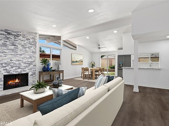 Move in ready and completely renovated single-story pool home in terrific Anaheim neighborhood offering 4 bedrooms and 2 bathrooms with 1,375 Sq Ft of living space and sitting on a 6,000 Sq Ft lot Features include; ~~New Interior & Exterior Paint ~~New Dual Pane Windows ~~New Laminate Plank Flooring ~~New Custom Baseboards ~~New Kitchen ~~New Stainless Steel Appliances ~~Updated Bathrooms ~~New Ceiling Fans ~~New Hardware ~~New Fixtures! The interior is open and spacious with gorgeous vaulted beamed ceilings, recessed lights, and completely updated. Enter through custom double doors into the living room with stacked stone, floor to ceiling, fireplace. The living room opens to the dining area which flows into the brand new kitchen which features quartz counters, full wall tile backsplash, white cabinetry, stainless steel appliances, and a deep basin stainless steel sink. This home has 4 bedrooms including the large primary suite with private bathroom, and a walk-in closet with built-in shelving. There is also a full-size hall bathroom for the 3 secondary bedrooms and guests to share. Enjoy the private in-ground swimming pool and spa in front of the home, with lots of privacy from the block wall fencing, there is also a 2-car garage, driveway parking for 5 cars, and a private backyard with grass area, concrete area and a garden bed. Conveniently located near shopping, dining, schools, and close to everything that beautiful Southern California has to offer! Schedule your private tour today!